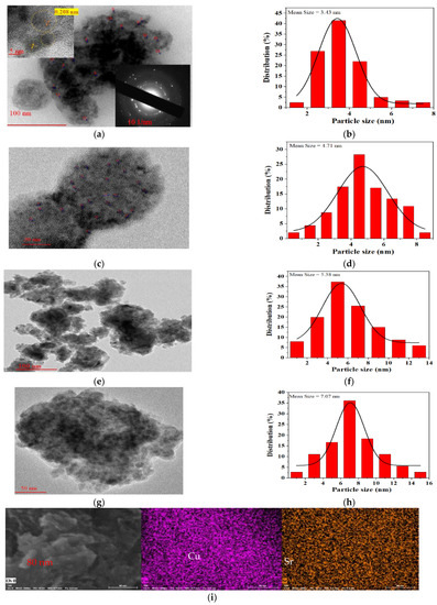(a,c) TEM images of freshly reduced 5%Sr-30%Cu/SiO2 and 30%Cu/SiO2 catalyst, and (b,d) represent the particle size distribution, respectively; (e,g) TEM images of spent 5%Sr-30%Cu/SiO2 and 30%Cu/SiO2 catalyst; (f,h) are respective size distribution; (i) FESEM image of elemental map of reduced 5%Sr-30%Cu/SiO2 catalyst and the corresponding EDS elemental mappings of Cu and Sr.