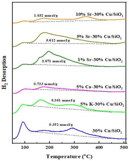 Figure 6 shows the TPD profiles of hydrogen desorption from Cu/SiO2 and promoted catalysts. H2-TPD is a dynamic method that was used to analyze the adsorption behavior of H2 on preactivated (in pure hydrogen) catalysts. Two significant desorption peaks have been observed in all catalysts. The first, ranging from 50 °C to 130 °C, is linked to the chemisorbed H2 on the surface of the Cu, and the second broader peal ranges from 135 °C to 450 °C, which could be related to the chemisorbed splitting H species on the surface of the catalyst [52,53]. Moreover, the presence of a broader peak could be an indicator of many small metal particles [54]. In addition, the amount of H2 desorption based on the second peak was calculated and was in the following order: 5%Sr-30%Cu/SiO2 > 1%Sr-30%Cu/SiO2 > 10%Sr-30%Cu/SiO2 > 5%Ca-30%Cu/SiO2 > 5%K-30%Cu/SiO2 > 30%Cu/SiO2. Among all tested catalysts, the adsorption of split H-H on 5%Sr-30%Cu/SiO2 is the largest and that of 30%Cu/SiO2 is the smallest, which is consistent with the catalytic activity, indicating the importance of split H-H adsorptions [55]. It is also clear from Figure 6 that the intensities of H2 desorption peaks, as well as the amount of H2 desorbed, are clearly affected by Sr loading because Cu loading was unchanged. Accordingly, the higher SCu value of 5%Sr-30%Cu/SiO2, as shown in Table 1, and the intensities of broad high temperature peaks are enhanced by the promoter, suggesting that the presence of two chemisorbed H-species is linked to the introduction of the promoter in Cu/SiO2-based catalysts. Hence, the Sr-promoted catalyst has significantly enhanced hydrogen activation by influencing the electronic structure of metal contents and their mobility on the support and the concentration of active H-species on the catalyst surface.