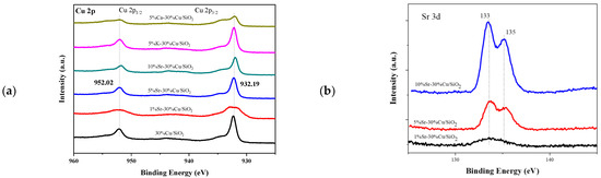 (a) Cu 2p spectra (b) Sr 3d XPS spectra of reduced 30%Cu/SiO2 and xM-30%Cu/SiO2 of as reduced catalysts.