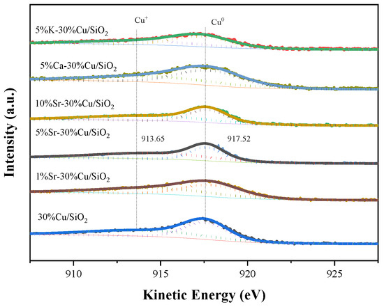 The deconvolution performed over the recorded Cu LMM spectrum and shown in Figure 8 represents two overlapping peaks at 913.6 and 917.5 eV assigned to Cu+ and Cu0, respectively. Table 3 shows that the ratio of Cu+/(Cu0 + Cu+) is affected by the addition of promoters, and its value declined to 0.43 and 0.42 for 5%K-30%Cu/SiO2 and 5%Ca-30%Cu/SiO2, respectively, suggesting the introduction of promoters that influence the amount of Cu+ species on Cu/SiO2 catalyst. Table 3 also shows that both Cu+ and Cu0 content were affected by the promoter, and, in the case of Sr-promoted catalysts, also by the amount of promoter. As a consequence, 5%Sr promoted catalysts would generate more active sites and therefore enhance the Cu dispersion as compared to other promoted and non-promoted catalysts. Moreover, further increasing Sr content would not be advantageous. This implies that there is strong interaction or bonding formed between Cu and Sr species, as previously reported in the case of other Cu-promoted catalysts, which is also a reason for enhanced dispersion and higher Cu+ contents [38].