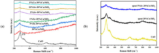 Raman spectra of all the promoted and non-promoted calcined catalysts alongside bulk CuO were also recorded and shown in Figure 9. Bulk CuO represented three characteristic bands, with a peak at 275 cm−1 being the most prominent. Although this band was observed in Cu/SiO2 with no significant shift, in 5%Sr-Cu/SiO2 catalysts a minor shift towards lower wavenumbers was observed, which could be a reflection of better metal support interaction derived from the formation of copper phyllosilicates. Similarly, in Figure 9b, the Raman spectra of spent catalysts were presented, and these catalysts were tested for long-term testing of almost 300 h. It could be seen that the characteristic peaks of both catalysts are still there, but the intensity of peaks was reduced. This implies that the crystallinity of the catalysts has been compromised as well as activity of the catalysts, hence, agglomeration of copper species is believed to be a major cause of the deactivation of Cu-based catalysts [58]. Wen et al. also reported that leaching of SiO2 from Cu/SiO2 catalysts could enhance rate of agglomeration of copper species after longer activity tests, therefore reducing the activity after an extensive time, and this could also be confirmed from TEM results presented in Figure 4 [59,60].