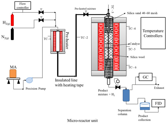 The catalytic performance of Vapor phase MA hydrogenation was evaluated using a stainless-steel fixed-bed tubular microreactor installed vertically in a furnace, as shown in Figure 10. In a typical run, about 1.0 g 40–60 mesh size catalyst was loaded in the center of the reactor with both sides plugged with glass wool, and the rest of the reactor was packed with quartz powder (40–60 mesh). Before the hydrogenation reaction, the catalyst was activated in situ by heating at steady-state (2 °C/min) from room temperature to 350 °C under pure hydrogen flow for 4 h. In the next step, the reactor was cooled down to achieve the required reaction temperature (180 °C to 280 °C) and the system was pressurized slowly to targeted pressure (2.0–3.0 MPa) to test all the promoted and non-promoted xM-30%Cu/SiO2 catalysts. MA was fed into the pre-heater with a high-pressure precision pump, where it was evaporated and pre-mixed with H2 and carried into the reactor with H2 flow. Standard reaction conditions were H2/MA ratio of 15, GHSV fixed at 3000 h−1, LHSV in the range of 0.5–4.0 h−1, temperature 250 °C, and pressure at 2.5 MPa. The product stream (a mixture of methanol, ethanol, unreacted MA, and H2) was passed through a condenser, and separated product gases were analyzed by an online gas chromatograph, whereas separated liquid products were analyzed by a gas chromatograph device (Ruihong SP-7890, Tengzhou, Shandong, China) equipped with a flame ionization detector (FID) and an OV1701 capillary column. Shimadzu GC-MS (QP2010, Nakagyo-ku, Kyoto, Japan) was used to identify the contents of product mixture. The internal standard method with iso-butanol as the internal standard was used to calculate the conversion of MA and selectivity of ethanol. Once the system achieved steady-state, three readings were taken and the error bar was calculated.