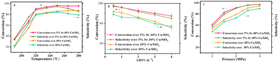 Figure 11 presented the MA conversion, and ethanol selectivity for 5%Sr-30%Cu/SiO2 and 30%Cu/SiO2 at different reaction temperatures, liquid hourly space velocity (LHSV), and pressures. As shown in Figure 11a, the two catalysts were further evaluated to check the effect of temperature on the activity of the catalyst, and therefore the temperature was changed from 190 °C to 280 °C. Both conversion and selectivity improved significantly throughout temperature range in Sr-promoted catalyst. It was observed that MA conversion and selectivity of ethanol increased by almost 50% when the temperature was increased from 190 °C to 220 °C in the case of Sr-promoted catalyst. It was also evident from data collected that activity was highest in terms of percentage yield (92.2%) at 250 °C, although MA conversion further increased a few points at 280 °C at the stake of ethanol selectivity, which was due to possible side reactions that occurred at higher temperatures and the consequent formation of byproducts, as was reported in our previous work [29].