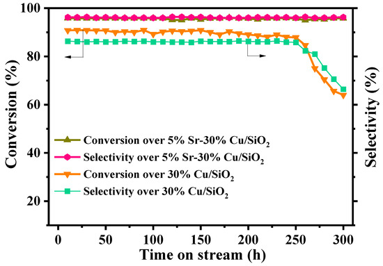 The comparison of long-term stability of best-performing promoted catalyst with non-promoted catalyst is of tremendous significance from both academic and industrial perspectives. The comparison of long-term catalytic stability of 5%Sr-30%Cu/SiO2 and non-promoted 30%Cu/SiO2 is presented in Figure 12. The Sr-promoted catalyst exhibited excellent stability and performed exceptionally for more than 300 h continuously in terms of MA conversion and selectivity for ethanol, which remained at 95% and 96%, respectively. However, a time-dependent decrease in the activity of the non-promoted catalyst was observed with a slow decline after 150 h, and this could be due to agglomeration of Cu species, as was evident from an increase in mean particle size to 7.07 nm of spent Cu/SiO2 catalyst, as shown in Figure 4e. Many previous works had reported that the inactivation of the Cu-based catalyst was mainly caused by the agglomeration of copper species; thus, we focused on the observations of agglomerative phases by TEM and Raman to verify this phenomenon [59,60]. It also could be found that after long-term testing of catalysts, a major loss to catalyst activity in the case of 30%Cu/SiO2 catalyst was due to agglomeration of Cu species, which could also be confirmed from TEM of spent catalysts presented in TEM analysis. However, there is a very minute effect observed in the case of 5%Sr-30%Cu/SiO2 catalyst, hence the almost negligible effect in activity. Furthermore, this decline in activity became clearer from 250 h for both MA conversion and selectivity of ethanol.