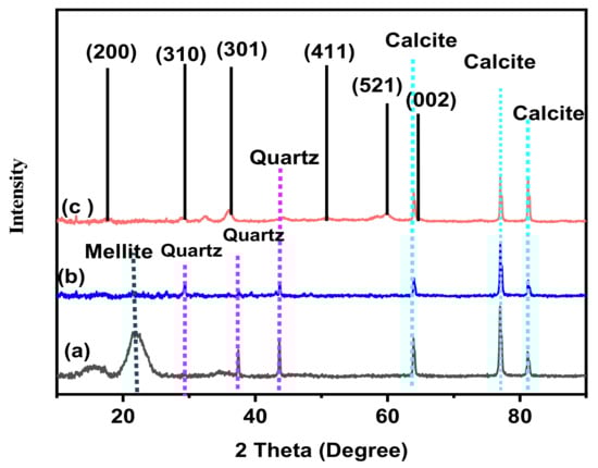 To investigate the phase purity and the crystallinity of the prepared samples, the XRD technique was used, and the results are presented in Figure 1. The characteristic peaks in the XRD pattern for the palm waste raw material (Figure 1a) indicate the existence of a broad peak at 22.06° 2θ of a carbon-containing mineral mellite (Al2[C6(COO)6.16H2O). Ju et al. [29] obtained similar results at 20.53° 2θ with bleach wood pulp, while Munir et al. [30] reported that date palm waste has this broad peak at 21.48° 2θ. This biomass in palm waste was lost during the pyrolysis, as shown in Figure 1b,c. Figure 1 shows that the major crystalline peaks of the biochar from the palm waste were quartz (SiO2) peaks at 2θ: 29.16°, 37.24°, and 43.32° and a calcite (CaCO3) peak at 64.16°, 76.8°, and 81.04° 2θ [31,32]. These peaks were still present, even after pyrolysis. Figure 1c shows the distinguishing peaks of the Mn nanoparticles in the MnO2/PF biochar nanocomposite in 2θ values at 18.48°, 29.04°, 37.04°, 50.44°, 60.36°, and 65.08°, indexed to (200), (310), (301), (411), (521), and (002) crystal planes, respectively [33,34]. These diffraction peaks confirm the presence of the α-MnO2 crystal phase according to JCPDS no. 44-0141 standard data [35].