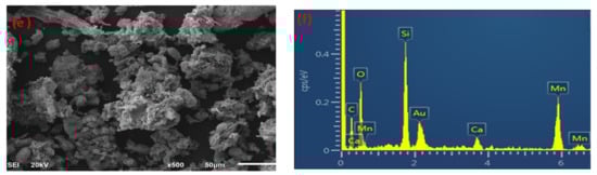 EDX analysis was used to investigate the elemental composition present in the palm waste, its biochar, and the MnO2/PF biochar nanocomposite. Figure 2b,d,f show the presence of different elements on the materials for the raw palm waste, biochar, and MnO2/PF biochar nanocomposite. The EDX spectra (Figure 2b,d,f) show characteristic peaks which are corresponding to carbon, oxygen, silicon and calcium. These EDX peaks are attributed to the quartz and calcite composition of the raw material and its biochar [37,38], while the presence of manganese element on the MnO2/PF biochar nanocomposite surface confirmed the effective synthesis of the MnO2 NPs [39]. The presence of Au peaks originates from the Au coating, which was performed to minimize the surface electron charging via the EDS [40].