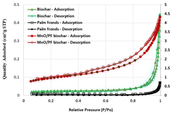 The nitrogen adsorption–desorption isotherm of the palm fronds, biochar, and MnO2/PF biochar is presented in Figure 4. This figure shows that the palm fronds and biochar possessed type II and IV isotherms with an H3 hysteresis loop [43], indicating the presence of macroporous and mesopores structures, while the MnO2/PF biochar adsorbent possessed a type IV isotherm with an H3 hysteresis loop, which is characteristic of a solid with a mesoporous structure [43]. On the other hand, the textural properties of the adsorbents are tabulated in Table 1. Moving from palm waste to the MnO2/PF biochar, significant increases in the surface area and average pore diameter were confirmed. It was found that the surface area of the MnO2/PF biochar was 153 and 41 times more than those of the palm fronds and biochar, respectively, while the average pore diameter of the palm fronds was increased from 0.0018 cm3/g to 0.0123 cm3/g and 0.1363 cm3/g for the biochar and MnO2/PF biochar, respectively. Moreover, as seen in Table 1, for all the samples, the average pore size diameter was in the range of 11–48 nm. This confirms that the studied samples have mesoporous structures.