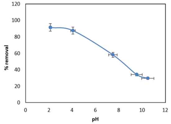 The pH of the MO solution has a significant effect on its removal because it has great influences on the adsorbent surface’s properties, as well as the ionization degree of the MO. [45]. To estimate the influence of the solution pH on the MO sorption, an experiment was conducted at different pH values, ranging from 2.0 to 11.0 and keeping the MO initial concentration of 10 mg/L, contact time of 24 h, and 0.07 g dose of MnO2/PF fixed. As shown in Figure 5, at pH 2.5, the MO removal efficiency reached the maximum value of 91.5%. With the increasing in the pH of the solution from pH 4 to 11, it was noticed that the value of the adsorption percentage (RE %) decreased. A very weak percentage of the removal efficiency (29%) was detected when the solution pH was higher than 10. This could be due to the high deprotonation of the MnO2/PF surface, which, accordingly, will bear a negative charge. Therefore, a strong repulsive force will happen between the MO anions and the negative adsorbent surface, and thus delay the MO reaching the MnO2/PF surface [46]. In contrast, when the solution pH decreased, the MnO2/PF surface became positively charged and attracted the negative MO anions, leading to a higher removal efficiency. Similar results have been reported by many researchers on the adsorption of MO onto various adsorbents [47,48,49]