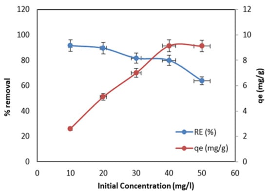 Figure 6 demonstrates the effect of different MO concentrations, varying from 10 to 50 mg/L at pH 2.5, 0.07 g adsorbent dose, and 25 °C. From Figure 6, it is clear that with the increase in the MO initial concentration, the removal efficiency decreased. The higher removal efficiency was 91.5% for 10 mg/L, and with further increases in the initial concentration, the removal percentage decreased to 61.9% for 50 mg/L. This is owing to the limitation of the active site on the MnO2/PF surface, since the amount of adsorbent was kept constant while the initial concentration was increased from (10–50 mg/L). Additionally, the increase in the MO concentration makes the active sites on the MnO2/PF biochar adsorbent saturated very fast, so there is no available active site on the adsorbent surface for the MO molecules to react with. Similar observations were reported by Hemamalathi et al. [41] and Lu Han et al. [42]. However, the adsorption capacity increased from 2.61 to 9.11 mg/g with the increase in the initial concentration of MO from 10 to 50 mg/L (Figure 6). This is because of the increase in the mass transfer driving force, with an increase the initial concentration of the solution.