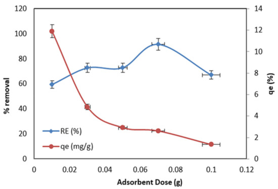 Figure 7 shows the effect of the various masses of the MnO2/PF biochar nanocomposite, ranging between 0.01 and 0.1 g with the MO removal efficiency and adsorption capacity (qe). The selected mass was mixed with 20 mL of the 10 mg/L Cr (VI) solution at pH 2.5 and 25 °C. In Figure 7, it is demonstrated that, with increase in dose amount, the MO removal efficiency increased, while the adsorption capacity of the MnO2/PF decreased. It can be seen that, with the increase in the adsorbent dosage from 0.01 to 0.07 g, there was a considerable increase in the removal percentage of MO, from 59.4% to 91.5%, possibly owing to an increase in the number of adsorption active sites [50]. However, the higher doses of the MnO2/PF result in a lowering of the removal percentage of MO to 37.72%. In fact, at the low dosage of adsorbent, there will be a well dispersion of the MnO2/PF biochar in an aqueous solution, so that all the MnO2/PF surface active sites are uncovered, which can increase the affability of the MO molecules to the MnO2/PF active sites. Therefore, the active sites of the adsorbent are quickly saturated, resulting in a high removal percentage. Conversely, the higher adsorbent dosages make the availability of the higher energy adsorbent active sites decrease, and occupy a large fraction of the active sites with lower energy, which decrease with the adsorption removal. Additionally, when the adsorbent doses increase, it leads to particle aggregation, due to the collision between the adsorbent nanoparticles which reduce the total surface area, which results in a decrease in the percentage removal of the MO from an aqueous solution. Therefore, the optimal dosage (0.07 g) was selected for the rest of the study [50]. On the other hand, it was found that the adsorption capacity values of the MnO2/PF biochar nanocomposite were gradually decreasing upon the increasing the adsorbent dosage, suggesting that higher numbers of adsorbent functional groups are available compared to the number of interacting MO.