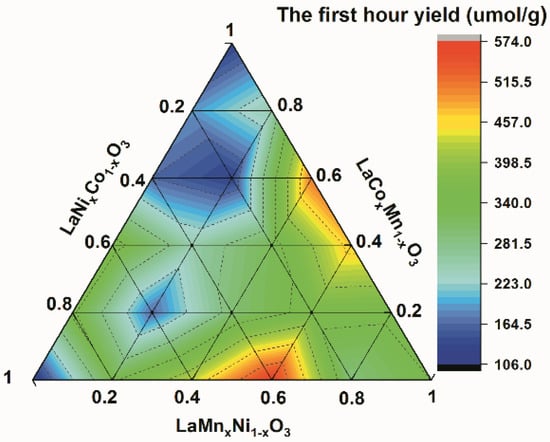 The first hour of CH4 yield of LaCoxMn1−xO3, LaMnxNi1−xO3 and LaNixCo1−xO3 (x = 0, 0.2, 0.4, 0.6, 0.8 and 1.0).