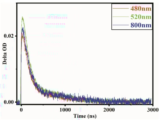Through TAS, the research has extracted the absorption spectrum for carriers in a TiO2 film, which contains conducting electrons, holes and trapped electrons. The conducting electron absorption increases with wavelength, while the trapped electrons show a strong absorption peak at 770 nm [36,37,38,39]. Because of the characteristics of materials, the absorption at 520 nm can be attributed to trapped electrons in this experiment. The different transient absorption peaks as the electrons are located in different chemical environments at different wavelengths. It can be said that the electrons located at different trapped depths, such as electrons at 520 nm, 760 nm and 840 nm are trapped more deeply. One more conclusion that can be drawn is that the TAS data recorded for the suspensions are most likely attributed to transients generated in the suspended semiconductor perovskite nanoparticles and not due to metal ions in the solution [40]. The electrons have a high absorption intensity and regularity at 520 nm. Therefore, 520 nm was selected as the photogenerated electrons’ characteristic absorption spectrum wavelength.