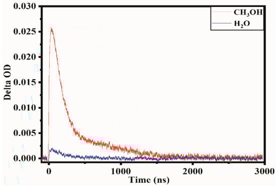 It is well known that carrier separation occurs under the action of photoexcited semiconductor catalysts, along with the generation of electrons in the conduction band and the holes in the valence band. As shown in Figure 5, in the absence of the hole quencher, the low carrier concentration indicates that the recombination of electron-hole pairs occurred quickly, which led to a low absorption intensity, but with a relatively slow decay, indicating that the electron-hole moved slowly in the particles. However, in the presence of CH3OH, the carriers’ absorption rate increased, reflecting that the recombination decreased significantly, indicating that holes can rapidly react with CH3OH, and the absorption primarily contributes to photogenerated electrons. This law is in line with previous studies of the TAS spectra for other materials [42,43]. The fast reaction can also state that the generated carriers exist on the surface of the particles, and photocatalytic reactions occur on the surface of the catalyst. These results can be used to determine that the transient decay curve with the presence of a hole quencher is the decay behavior for the trapped electrons instead of free electrons.