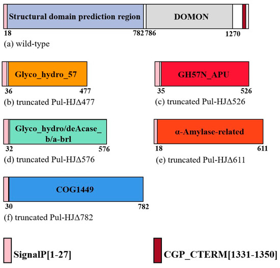 According to the search results of the conserved domain in NCBI and Inter PRO database comparison, the protein consists of 1372 amino acids. The primary function of the C-terminal functional region of the conserved domain structure was predicted as carbohydrate transport and metabolism and signal transduction. The protein was predicted to have six possible structural domains: the GH57 family conserved structural domain of COG1449 and Glyco_hydro_57, the carbohydrate-binding structural domain, the N-terminal catalytic structural domain of GH57N-APU heat-activated branched-chain, the glycoside hydrolase barrel structural domain of Glyco_hydro/deAcase, and the α-amylase-related structural domain. In this protein, the C-terminal structural domain is primarily composed of the carbohydrate-binding functional COG4945 structural domain. We also predicted the CGP-CTERM domain at positions 1331–1350. The structural domain has an essentially invariant motif, Cys-Gly-Pro, followed by a highly hydrophobic transmembrane domain, which is always located at the C-terminus of the protein (Figure 2). In Pang et al.’s study of the catalytic properties of Pyrococcus yayanosii CH1, the excised N-terminal domain increased the thermal stability and hydrolysis efficiency of the pullulanase enzyme [18]. Therefore, we designed different primers to truncate Pul-HJ21 according to the different lengths of the structural domains and investigated the changes in enzyme properties after truncation for different conserved domains at the N-terminal end.