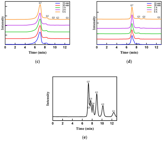 HPLC plots of Pul-HJ21 and Pul-HJΔ782 for the enzymatic digestion of pullulanase and soluble starch at different times. (a) HPLC analysis of Pul-HJ21 during the enzymatic digestion of soluble starch at different times; (b) HPLC analysis of Pul-HJ21 during enzymatic digestion of pullulan at different times; (c) HPLC analysis of Pul-HJΔ782 during the enzymatic digestion of soluble starch at different times; (d) HPLC analysis of Pul-HJΔ782 during the enzymatic digestion of pullulan at different times; and (e) elution peaks of reference standards.