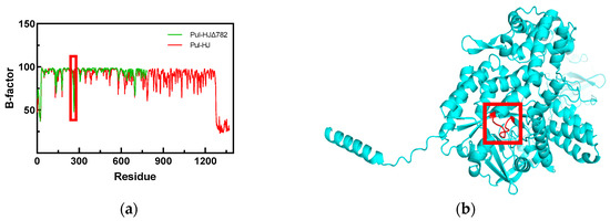 (a) B-factor values of Pul-HJ21 and Pul-HJΔ782; (b) the loop region with reduced B-value after truncation.