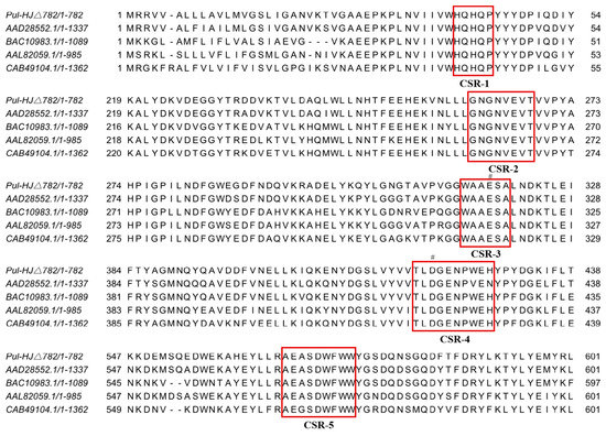 Pul-HJΔ782 was sequenced against the conserved sequences of different enzymes from the GH57 family (GenPept: AAD28552.1; BAC10983.1; AAL82059.1; CAB49104.1) by sequence alignment [19]. Based on the description of R. Zona et al., we identified five conserved sequence regions (CSR) from the GH57 family (Figure 7). CSR-1 is the His42-Gln43-Pro44 co-identifier sequence. The Glu266 of CSR-2 is also defined as one of the most conserved amino acids. CSR-2 and CSR-3 contain two catalytic residues, and Glu318 is identified as the catalytic nucleophilic residue and Asp421 as the proton donor [40]. A higher conserved Asp566 is present in CSR-5, which was also shown to interact with two active-site water molecules [19]. It is noteworthy that in the structural model, CSR-2 was located in a flexible ring, and the rigidity of this flexible ring was enhanced after truncation. Consequently, the stability and catalytic efficiency of Pul-HJΔ782 were changed. In their study of the glycogen branching enzyme from GH57, S. Na et al. found that the flexible ring next to the active site had an important role in the overall catalytic reaction and the flexible ring was directly involved in the catalytic reaction [38]. For 259L-265E in Pul-HJΔ782, they did not construct a catalytic pocket with Glu318 and Asp421, but 259L-265E connects the α-helix and β-fold of the (β/α)7 barrel structure. The increased rigidity in the 259L-265E range also suggested that the (β/α)7 barrel structure will have better backbone support. Combined with our results, we found that a more stable catalytic backbone could lead to higher stability and better catalytic efficiency in catalytic reactions at higher temperatures.