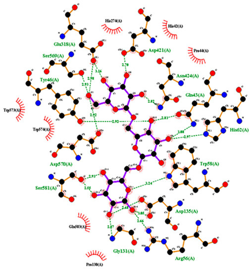 Using AutoDock, we then performed molecular docking with Pul-HJΔ782 as the ligand isomaltotriose as the acceptor. The docking results showing the active region are presented in Figure 8. All ligand conformations generated were scored on the basis of the degree of binding (kcal/mol). The best position chosen, −9.2 kcal/mol, was analyzed for the forces formed between the ligand and receptors. In the results of AutoDock, Glu318, Ser569, Tyr46, Asp570, Ser581, Gly131, Arg56, Asp135, Trp58, His62, Gln43, Asn424, and Asp421 were involved in hydrogen bonding as proton donors and acceptors. Among the ligands, Trp573, Trp574, Gln583, Pro130, Pro44, His42, and His274 formed hydrophobic interactions with the acceptor (Figure 9). Of them, Glu318 and Asp421 coincided with the catalytic site of type II pullulanase already reported [19,41,42,43]. Moreover, in the GH57 enzyme-specific position, His40 was identified as involved in the donor 1 subsite, and His42 was indirectly involved in catalytic reactions via water molecules [40,41]. Combined with the result that the conserved catalytic site appears upon docking with isomaltotriose, the smallest unit produced during the enzymatic cleavage of pullulanase, we speculate that Pul-HJΔ782 also has pullulanase hydrolase activity [2].