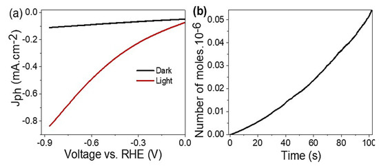 (a) The voltage-current relation in dark and light and (b) the H2 moles produced vs. time for the CuFeO2/CuO/Cu photoelectrode.