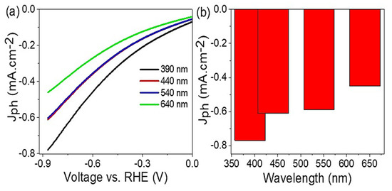The performance of the prepared CuFeO2/CuO/Cu photoelectrode was evaluated under monochromatic light by studying the effect of different light wavelengths (390–640 nm) on the H2 generation reaction. The results, presented in Figure 4a, show that the Jph values increased from −0.45 to −0.79 mA·cm−2 as the wavelength increased from 390 to 640 nm. Figure 4b shows the produced Jph values at −0.88 V, confirming that the sewage water splitting and H2 gas evolution reactions were enhanced with increasing incident photons.