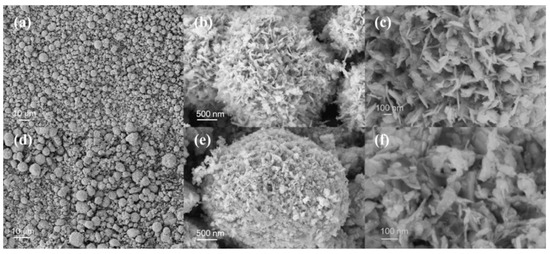 SEM images of (a–c) In2S3 and (d–f) Pt/In2S3.