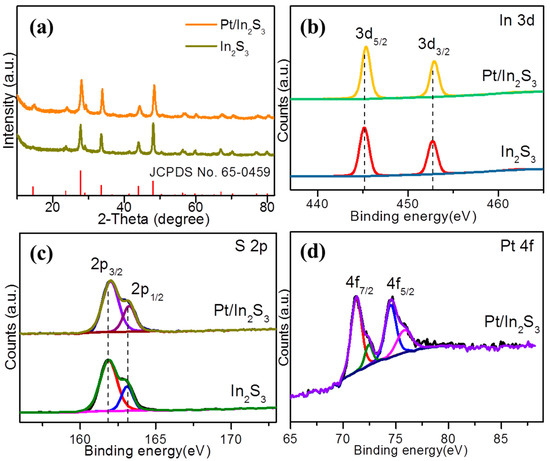 (a) XRD patterns of In2S3 and Pt/In2S3. XPS spectra of (b) In 3d, (c) S 2p and (d) Pt 4f.