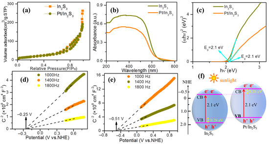 (a) Nitrogen adsorption–desorption isotherms, (b) UV-vis DRS spectra and (c) band-gap energies of In2S3 and Pt/In2S3. M-S plots of (d) In2S3 and (e) Pt/In2S3. (f) The relationships of band energy positions between In2S3 and Pt/In2S3.