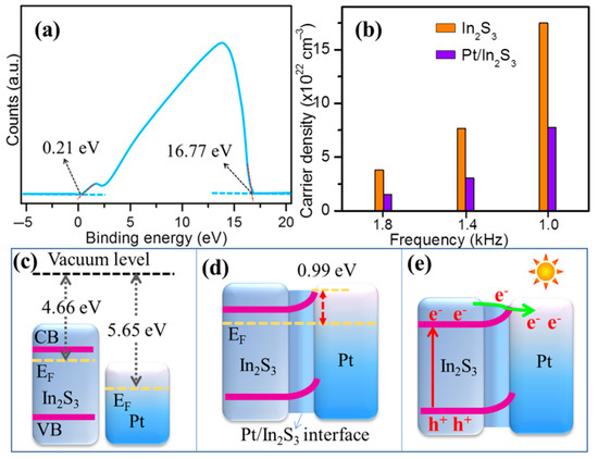 (a) UPS spectrum of In2S3. (b) Carrier densities of In2S3 before and after Pt modification. Energy level diagrams for In2S3 and Pt (c) before and (d) after interfacing. (e) Illustration of photoexcited electrons transfers from In2S3 into Pt over Pt/In2S3 interface under light irradiation.