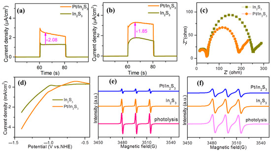 Transient photocurrent responses of catalysts (a) without and (b) with methyl viologen dichloride (MVCl2). (c) EIS plots, (d) LSV curves, (e) TEMPO-e− EPR spectra and (f) TEMPO-h+ EPR spectra of In2S3 and Pt/In2S3.