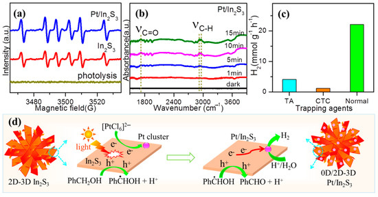 To further inspect the conversion process of PhCH2OH in this dual-function photocatalysis system, the in situ EPR with the addition of DMPO and in situ DRIFT were carried out [5,31,72,73,74]. As presented in Figure 8a, PhCH2OH with DMPO under light irradiation could not produce EPR signals (photolysis). However, sextet peaks belonging to carbon-centered radicals (.CH(OH)Ph) [5,68] were observed on In2S3 and Pt/In2S3. This means that the conversion process of PhCH2OH is a free radical reaction. Moreover, the EPR intensity of Pt/In2S3 was more intense than In2S3, implying efficient charge separation-transportation and fast PhCH2OH dehydrogenation on Pt/In2S3. In addition, one peak at 1703 cm−1 (νC=O) fell to the carbonyl group (C=O) of benzaldehyde (PhCHO) and doublet peaks at 2873 and 2935 cm−1 (νC-H), attributed to the carbon–hydrogen bond (C-H) of the aldehyde group, were clearly observed on Pt/In2S3 under simulated sunlight (Figure 8b). These results indicate that PhCH2OH is selectively oxidized into PhCHO via a carbon-centered radical process. The effects of the reactive species on PHP were also investigated by the trapping experiments (Figure 8c). Triethanolamine (TA) and carbon tetrachloride (CTC) were used as trapping agents for photoexcited holes and electrons, respectively. When TA was added into the reaction system, the H2 production rate decreased. This indicates that the dehydrogenation of PhCH2OH to H2 production is restrained by TA. For the trapping agent CCl4, a relatively large decrease was observed in the H2 production rate. This indicates that the photogenerated electrons are major reductive species for the reduction in protons to H2. These results suggest that synergistic effect occurred between PhCH2OH dehydrogenation and H2 production.