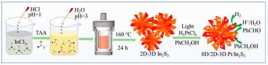 The 0D/2D-3D Pt/In2S3 heterostructure was prepared as depicted in Figure 9. Briefly, InCl3 was wholly dissolved into acid solution and reacted with thioacetamide (TAA) to form [In(TAA)4]3+ and [In(TAA)6]3+ complexes via In-S bonds [75]. Then, these complexes underwent the hydrothermal process to produce 2D-3D In2S3. In2S3 was easily formed because the solubility product constant (Ksp) of In2S3 was very small (5.7 × 10−74) [75]. Finally, Pt/In2S3 heterostructure was obtained by an in situ photodeposition process. Namely, the Pt/In2S3 was synthesized in the process of PHP coupled with simultaneously selective phenylcarbinol conversion.