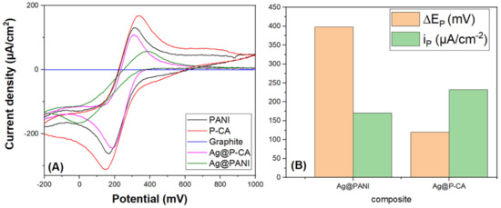 To compare the electroactivity of the composites, CVs were measured in PBS-7 solution at a scan rate of 20 mV·s−1 using potassium ferricyanide as a redox marker (Figure 8). The absence of a significant redox signal for a plain carbon paste electrode material without a catalyst (Ag NPs) was noted. CVs of Ag@PANI and Ag@P-CA had two peaks, which are assigned to oxidation and reduction in iron species (Fe (II)/Fe (III)). Based on Figure 8B, Ag@P-CA revealed a lower ΔEp (highest electron transfer rate) and higher ip (higher distribution of the target analyte on the surface of the electrode material), as compared with Ag@PANI. These results provide evidence for the successful modification of Ag@PANI, using CA as the doping acid and modifier.