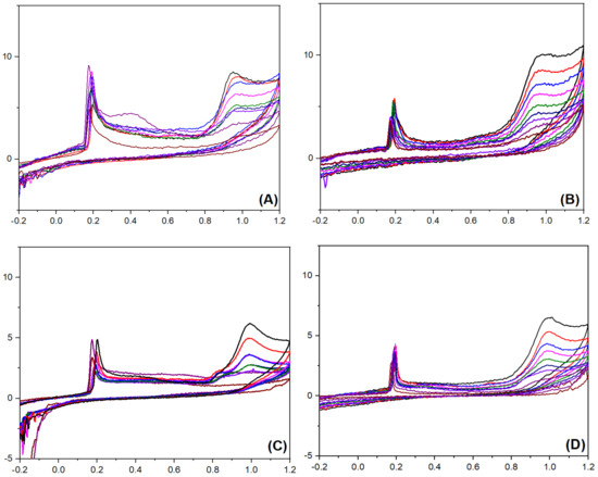 The CV profiles of PANI and its modified composites depend on the nature of the counter ion of the acid dopant, the degree of protonation, and the oxidation state of PANI [70,71,72]. Based on Figure 7, three oxidation states of PANI (cf. Figure 1) can be observed: LE, EB, and PG. LE was oxidized to EB at 200 mV, and EB was oxidized to PG at 650 mV. The reduction reaction from PG to LE (second sweep) with a low ΔEp showed the facile electron transfer between PANI chains [71]. After Ag NPs were deposited onto the composites, a new signature near 200 mV appeared, which was attributed to the oxidation of Ag (cf. Figure 7) [73].