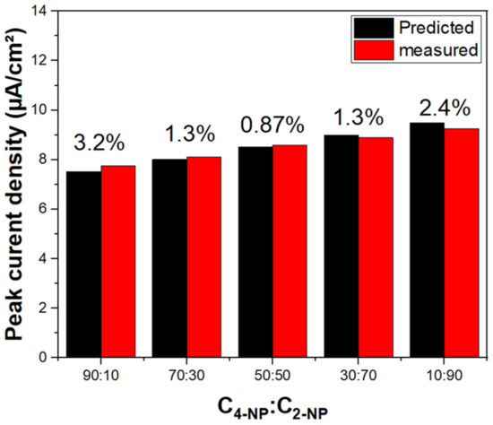 Nonselective detection of 2-NP and 4-NP with Ag@P-CA at different concentration ratios (C4-NP: C2-NP). The numbers above columns represent the error (%) based on the measured current densities compared to the predicted ones. Predicted current densities are based on the sum of calibration curves of 2-NP and 4-NP. The experiments were performed in PBS-7 buffer solution.
