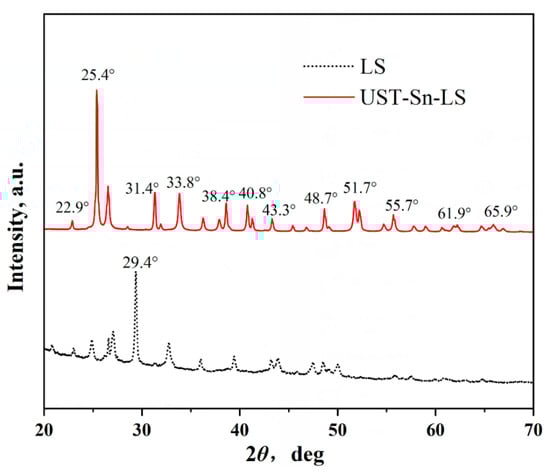 XRD characterization of raw LS and UST-Sn-LS. The 2θ angle was scanned between 20° and 70°.