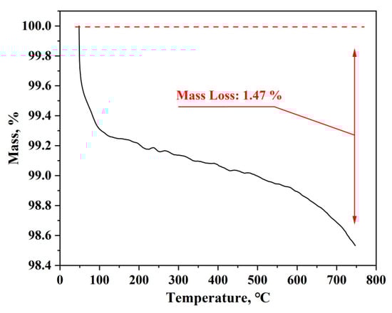 Thermogravimetric analysis (TG) was used to examine the structural changes of the samples with temperature, which to some extent reflected the thermal stability of the catalysts [49]. The TG curve of AT-Sn-WLS is illustrated in Figure 3. When the heating temperature reaches 750 °C, only 1.47% mass loss is observed on the AT-Sn-WLS prepared in this study, reflecting the good thermal stability of AT-Sn-WLS (Figure 4). The TG curve of AT-Sn-WLS is composed of three main stages for weight loss in the range of 50–750 °C. In the first stage of 50–100 °C, it is likely that CO2 emission and/or water evaporation causes the loss of weight. In the second stage of 200–400 °C, the degradation of the carboxyl group (-COOH) and hydroxyl group (HO-) may cause a slight mass loss [50]. In the third stage of 600–750 °C, the potential aromatization of the structural network may result in weight loss [51].