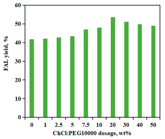 Solvent plays a key role in the heterogeneous catalytic reaction and the FAL yield is highly dependent on the reaction solvent [17]. By raising the DES ChCl:PEG10000 dose from 0 to 20 wt% at 170 °C for 30 min, the FAL yield rose from 41.7% to 53.5% (Figure 5). As the mass ratios of ChCl:PEG10000-to-water rose from 20:80 to 50:50, the FAL yields weakened slightly. In the presence of ChCl:PEG10000 (50 wt%), the FAL yield reached 48.9%. It was likely that an excessive DES load might confine the contact opportunity of substrate biomass to chemocatalyst to some extent, which would cause a slight decrease in the formation of FAL [44]. Obviously, the optimal DES ChCl:PEG10000 dose in the ChCl:PEG10000–water system was 20 wt%, and ChCl:PEG10000–water (20:80, wt/wt) was employed as an appropriate reaction medium for the valorization of corn stover into FAL.