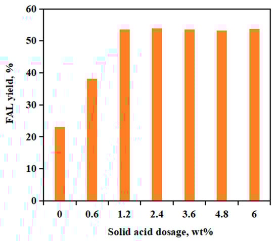 Effects of solid acid dosage (0–6 wt%) on the FAL formation in ChCl:PEG10000–water (20:80, wt/wt) (CS 75 g/L, 170 °C, 30 min).