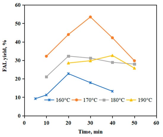 The catalytic temperature (160, 170, 180, and 190 °C) and catalytic duration (5–50 min) had a profound influence on the generation of FAL (Figure 7). The maximum FAL yield reached 53.5% using corn stover (75.0 g/L) as feedstock in the presence of UST-Sn-LS (1.2 wt%) as chemocatalyst in ChCl:PEG10000–water (20:80, wt/wt) at 170 °C for 30 min. The high reaction temperature was not only conducive to the dehydration of biomass-derived D-xylose to FAL, but also promoted the side reaction, which led to the degradation of FAL products through cracking, condensation, and resinization [26]. With the increase in the reaction time, the side reaction was enhanced and the FAL yield gradually dropped [31].