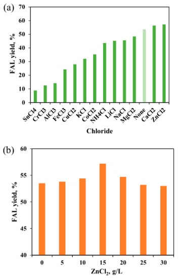 Effects of chlorides (15 g/L) on the FAL production in ChCl:PEG10000–water (20:80, wt/wt) (corn stover 75 g/L, solid acid 1.2 wt%, 170 °C, 30 min) (a); effects of ZnCl2 loading (0–30 g/L) on the FAL production in ChCl:PEG10000–water (20:80, wt/wt) (corn stover 75 g/L, solid acid 1.2 wt%, 170 °C, 30 min) (b).