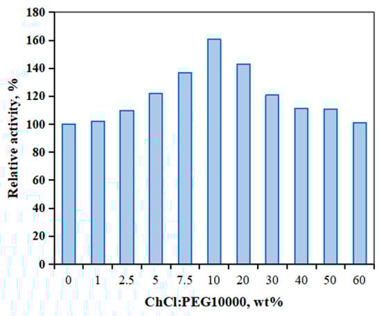 Effects of ChCl:PEG10000 load (0–60 wt%) on the biological reduction [NADP+ (1 mmol NADP+ per mol FAL, glucose (1.5 mol glucose per mol FAL), pH 7.0, 35 °C]. In the absence of ChCl:PEG10000, the bioreduction activity was defined as 100%. The FAL-reducing activity was quantified based on the bioreduction reaction rate.