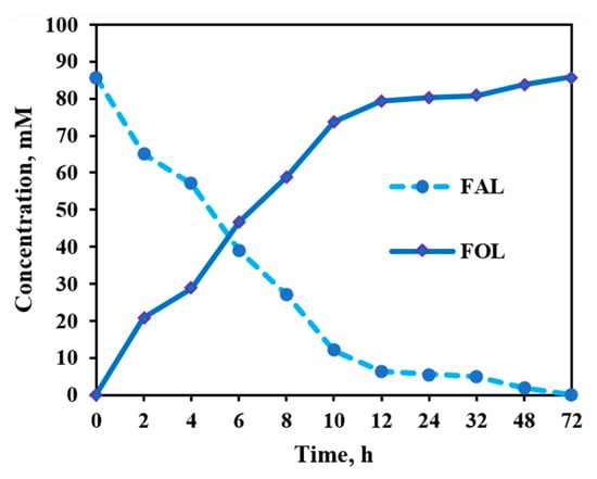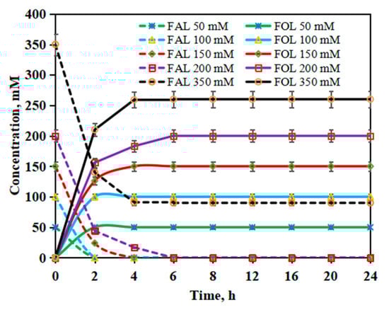 A different load of FAL (50–350 mM) was biological transformed into FOL with SF cells in ChCl:PEG10000–water (20:80, wt/wt) (Figure 11). No obvious substrate inhibition was detected when the FAL loading was in the range of 50–200 mM. The transformation of 50–200 mM FAL took 2–6 h, and a 100% FOL yield was obtained. An excessive load of FAL (>200 mM) would weaken the biocatalytic synthesis of FOL. After the transformation of 350 mM FAL for 4 h, FOL was obtained in the yield of 74.3%, and no further FOL was generated after 4 h.