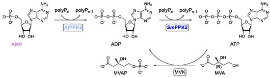 Enzyme cascade for adenosine triphosphate (ATP) production and regeneration and mevalonate phosphate (MVAP) production. Two polyphosphate kinases (PPKs) phosphorylate adenosine monophosphate (AMP) to ATP with polyphosphate (polyP) as phosphate donor. ATP is consumed by mevalonate kinase (MVK) to convert mevalonate (MVA) to MVAP.