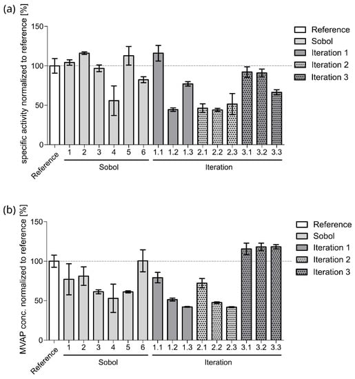 In addition, for a better overview, the data were plotted in Figure 2 and presented together with the data from the Sobol experiments. In the first iteration round, a specific activity of 10.2 ± 1.5 U mg−1 was reached (Iteration 1.1), which is comparable to the Sobol experiment with the highest specific activity (Sobol 2). Interestingly, the enzyme concentration required for ATP regeneration was reduced by 20%, which improves the product-to-enzyme ratio favorably; this is also in view of the potential application on a larger scale and the environmental impact in terms of the material that has to be used to produce a certain amount of the product [,,]. The experiment was conducted with low concentrations of AMP with 13.2 mM, which indicates that AMP is not a limitation if enough AjPPK2 and SmPPK2 are present. For iteration 1.2 and 1.3, the concentration limits of the enzymes were tested by the algorithm at the maximum addition of AMP, which resulted in a reduction in the specific activity to 3.9 ± 0.3 U mg−1 and 6.8 ± 0.4 U mg−1, respectively. In the second iteration, the algorithm explored a region of the parameter space with low sampling density by proposing experiments characterized by low concentration values for AjPPK2. Neither the specific activity nor the product concentration were improved. In fact, the specific activities were rather in the lower range compared to the previous experiments. Still, valuable information could be gained for the third and final iteration round. Here, specific activities were improved compared to iteration 2 and the same values as in the reference assay were achieved with 8.1 ± 1.0 U mg−1 and 8.0 ± 0.8 U mg−1, respectively. The product concentrations reached higher values than the reference assay in every experiment of the third iteration, from 50.8 ± 5.6 mM to 52.0 ± 2.1 mM MVAP. These values are slightly higher than the maximum possible 50 mM product. However, due to the standard deviation, the excess of the maximum possible concentration is not significant. Even though this was not the optimization goal, an improvement in product concentration could be achieved. This was, hence, a rather random result but could be included in Bayesian optimization in the future.