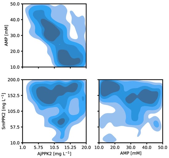 The final GPR model was applied to visualize the probability density of the maximum predicted activity, as illustrated in Figure 3. This visualization facilitates the identification of the optimal initial concentrations of the selected reaction components—namely, AMP, AjPPK2, and SmPPK2—in the presence of uncertainty. To determine the optimal concentrations, 10,000 samples of the final GPR model were analyzed. The resulting analysis allows for the identification of the regions of the parameter space which are more probable to correspond to the optimal experimental conditions. The different hues in the representation each signify 20% of the cumulative probability mass. As such, we can determine with 20% confidence that the optimum lies within the dark blue region of the parameter space. Additionally, a plateau, denoted by the darker blue hues, is predicted, where high activities can be obtained. These regions are dominant with higher amounts of SmPPK2, from ~130 to 200 mg L−1 and between ~5.75 and 18 mg L−1 of AjPPK2. AMP has less influence on the specific activity of MVK if enough enzyme is present.