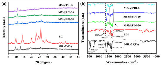 XRD patterns (a) and FT-IR spectra (b) of PDI, MIL-53(Fe) and MIL-53(Fe)@PDI heterojunctions.