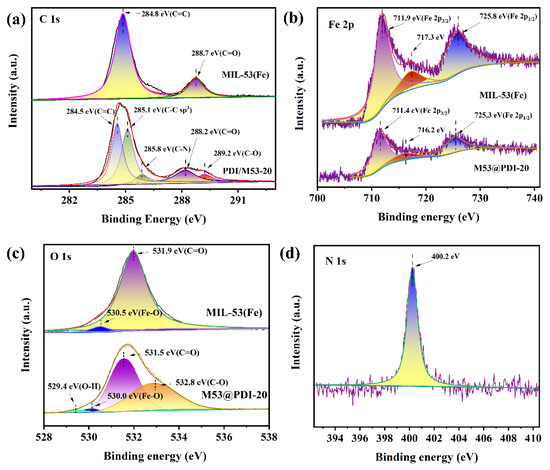 X-ray photoelectron spectra were used to determine the elemental compositions of the samples. From the full spectra of MIL-53(Fe) and M53@PDI-20 samples in Figure S2, it can be seen that the elements of C, O, N, and Fe are all present in the M53@PDI-20 heterojunction material and the obvious N element is only present in M53@PDI-20. In Figure 2a, the peaks with binding energies of 284.8 eV and 288.7 eV correspond to C=C on the benzoic acid ring and C=O on terephthalic acid [39]. In addition, the binding energy of 285.8 eV on M53@PDI-20 is attributed to the C–N signal peak. The Fe 2p in Figure 2b shows two peaks at 725.8 and 711.9 eV for Fe 2p1/2 and Fe 2p3/2, respectively. The distance between these two peaks is approximately 13.9 eV, and there is also a neutral peak at 717.3 eV, which is unique to MIL-53(Fe) [40], thus further demonstrating the successful synthesis of MIL-53 (Fe). In the O 1s spectrum (Figure 2c), two peaks at 531.9 and 530.5 eV are attributed to the oxygen component of the H2BDC and Fe–O bond on the organic bond of MIL-53(Fe) [3]. Additionally, in the O spectrum of M53@PDI-20, the peaks at 529.4,530.1,531.5 and 532.8 eV, where 529.4 and 532.8 eV correspond to C–O bonds in surfaces which adsorbed H2O and PDI [41], respectively, while 530.1 and 531.5 eV are consistent with Fe–O, C=O in MIL-53(Fe) and the binding energy is shifted towards lower binding energy shift. At the same time, the position of Fe 2p of M53@PDI-20 is shifted by 0.5 eV in the direction of the decreasing binding energy, indicating an increase in the electron cloud density on the Fe element and a strong interaction between MIL-53(Fe) and M53@PDI-20. In addition, there is a clear peak of N 1s on the M53@PDI-20 in Figure 2d, and the element N is specific to PDI, so MIL-53(Fe) and PDI were successfully integrated together to form the heterojunction.