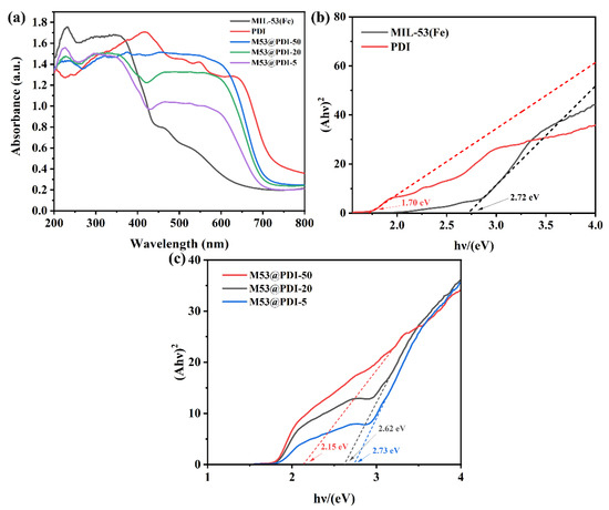 (a) UV–Vis diffuse reflectance spectra; (b) Tauc plots of MIL-53(Fe), PDI, and MIL-53(Fe)@PDI heterojunctions; and (c) Tauc plots of M53@PDI-50,20,5.