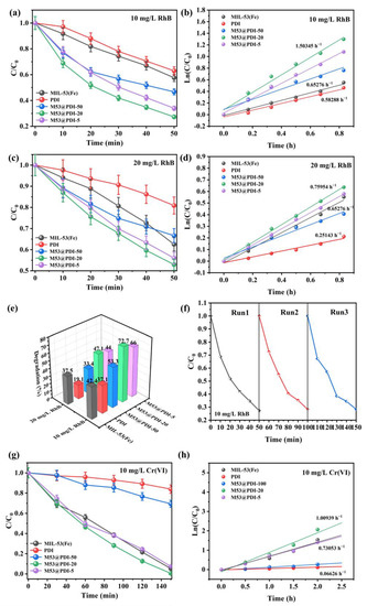 Photocatalytic capabilities for the degradations of (a,b) 10 mg/L, (c,d) 20 mg/L RhB, and the reduction of 10 mg/L Cr(VI) solution, (e) RhB removal rates over all samples, (f) the cycling degradation of 10 mg/L RhB on M53@PDI-20 and (g,h) over PDI, MIL-53(Fe) and MIL-53(Fe)@PDI heterojunctions under 400 W metal halide lamp irradiation, respectively.