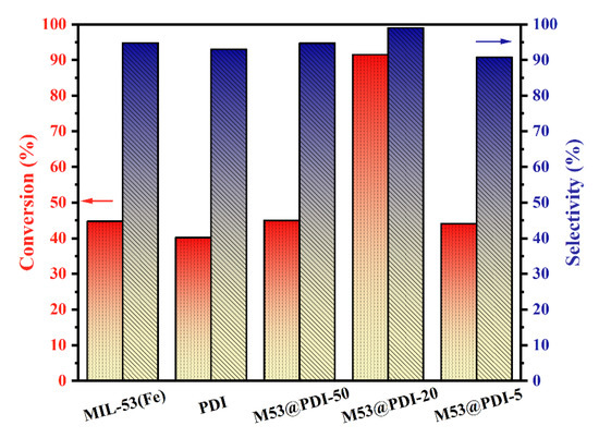 Furthermore, according to Figure 6, the photocatalytic effects of MIL-53(Fe) and PDI on the selective oxidation of benzyl alcohol are relatively weak, with conversions of only 44.7% and 40.2%, probably due to its low charge separation efficiencies. After loading the PDI organic supramolecule into MIL-53(Fe), the heterojunctions show a substantial increase in the photocatalytic rate for benzyl alcohol, and the conversion rate of benzyl alcohol over M53@PDI-20 organic heterojunctions increases to 91.5%. Additionally, the selectivities of these samples are all above 90%, also corresponding to the previous analysis, and M53@PDI-20 reaches a maximum selectivity of 99%.